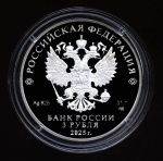рельефное изображение Государственного герба Российской Федерации, над ним вдоль канта — надпись полукругом «РОССИЙСКАЯ ФЕДЕРАЦИЯ», обрамленная с обеих сторон сдвоенными ромбами, под гербом слева — обозначения драгоценного металла и пробы сплава, справа — содержание химически чистого металла и товарный знак монетного двора, внизу в центре в три строки — надпись «БАНК РОССИИ», номинал монеты «3 РУБЛЯ», год выпуска «2025 г.».